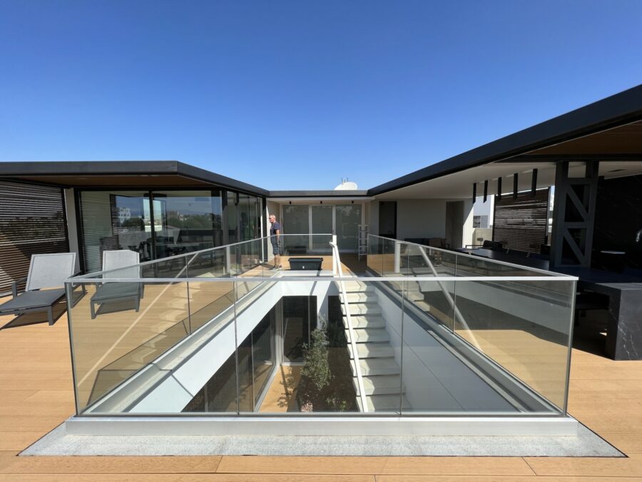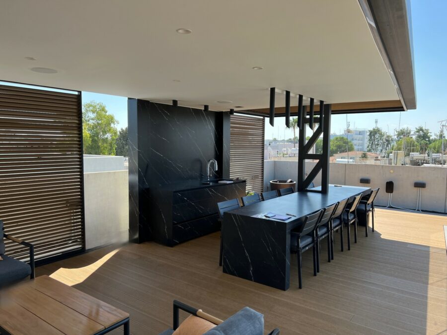 Sculptors Workshop/Office, Bar, Dining, Chill & Entertainment Areas. There are open sun tanning areas with perimeter green zones and a covered Bathroom Area that flanks the aforementioned. The offset from the Existing Boundaries made it possible to create a secluded private and hidden from view oasis that is accessible from the central courtyard of the Penthouse Apartment that extends to the Roofgarden with a central void to below.
